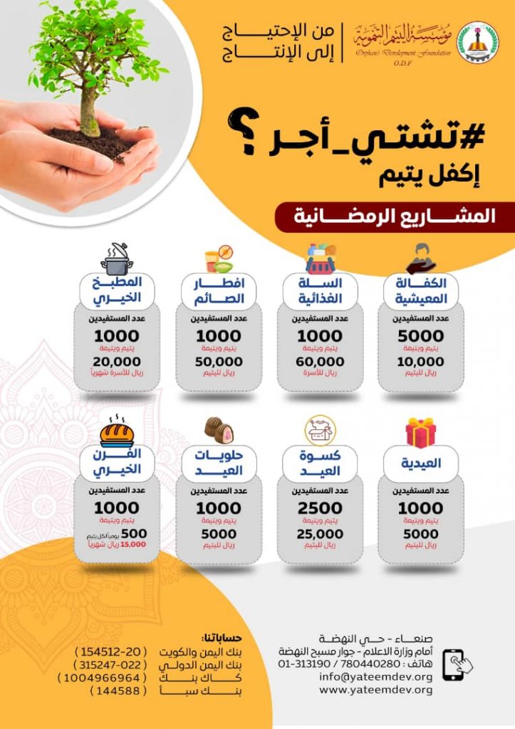 المشاريع الرمضانية 3 مارس، 2023 | لا توجد تعليقات ضمن حملة #تشتي_أجر؟ أطلقنا مجموعة من المشاريع الرمضانية التي نحتاج الى توفيرها وتوزيعها على الأيتام في شهر رمضان المبارك .. مؤسسةاليتيم التنموية