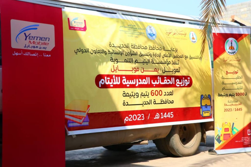 دشنت مؤسسة اليتيم التنموية بالشراكة مع شركة يمن موبايل ومؤسسة الشهداء ، اليوم توزيع الحقيبة المدرسية للأيتام بمحافظة الحديدة.