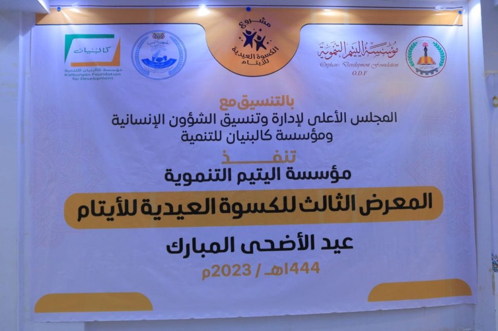 دشنت مؤسسة اليتيم التنموية بالتنسيق مع المجلس الأعلى لإدارة وتنسيق الشئون الإنسانية ومؤسسة كالبنيان للتنمية المعرض الثالث لكسوة عيد الأضحى لـ 500 يتيم بأمانة العاصمة للعام 1444هـ بتكلفة عشرة ملايين ريال.
