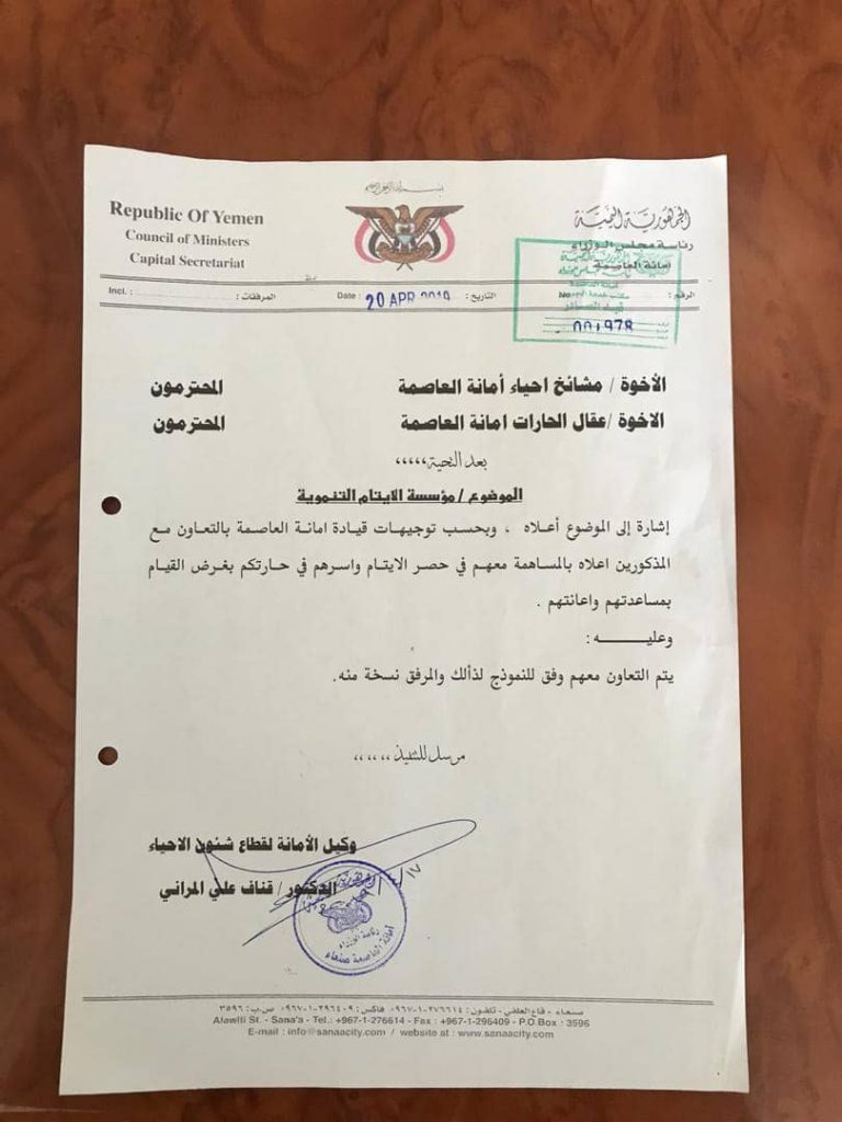 أمانة العاصمة توجه خطاببالتعاون مع المؤسسة للإخوة عقال الحارات ومشائخ أحياء أمانة العاصمةبخصوص حصر الأيتام